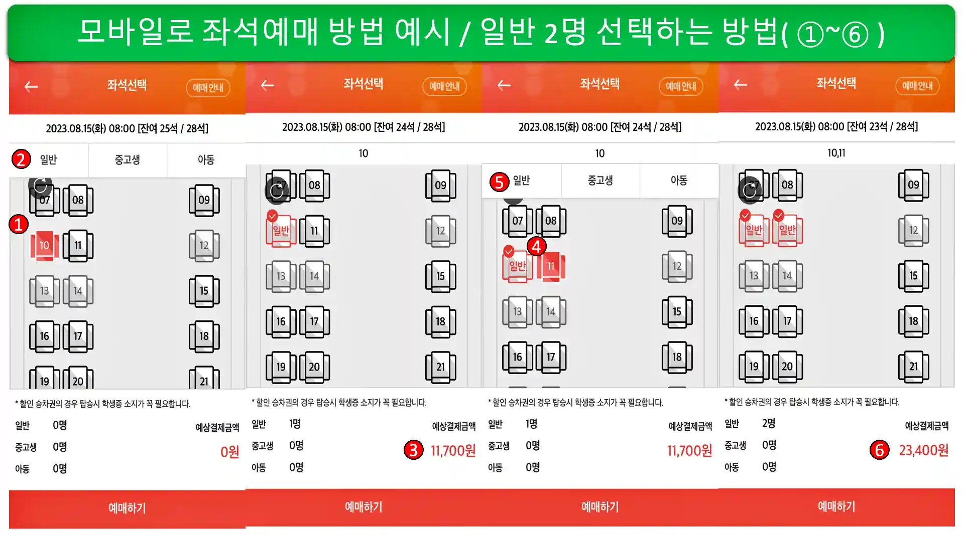 4. 좌석을 선택합니다. 좌석을 선택하고 일반, 중고생, 아동을 선택하면 됩니다. 아래 사진처럼 좌석을 먼저 선택하고, 일반, 중고생, 아동 중 좌석에 해당하는 사람을 선택하면 선택이 완료됩니다. 아래 사진을 보시면, 순서대로 따라 하신다면, 쉽게 좌석 선택을 하실 수 있습니다.