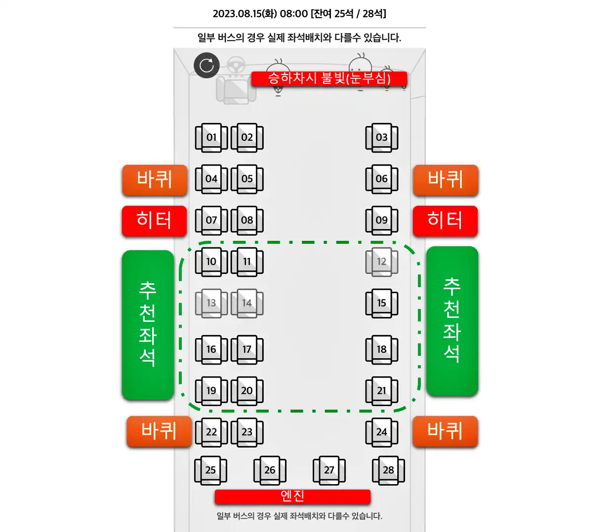 버스 좌석은 10번부터 21번 사이를 선택하시는 것을 권장드립니다. 이유는 사진에 표현한 것처럼 버스 바퀴와 가까울 경우 장시간 이동시 진동이 느껴지기 쉽고, 히터 근처는 겨울철에 너무 뜨거워서 멀미 위험이 있기 때문입니다.