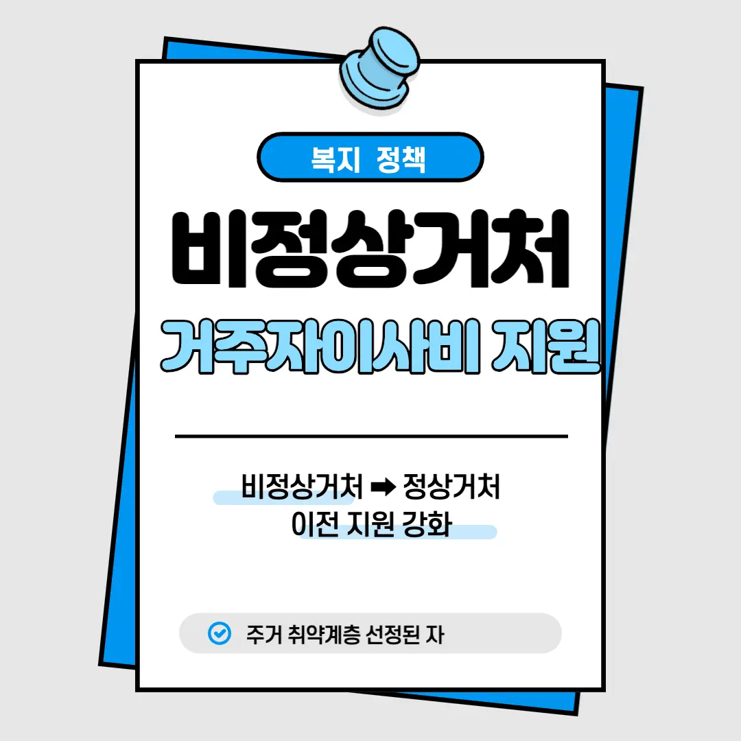 | 지원내용 | 비정상거처 거주자의 정상거처 이전 지원을 강화하기 위해 정부 재원을 통해 이주비 지원 |