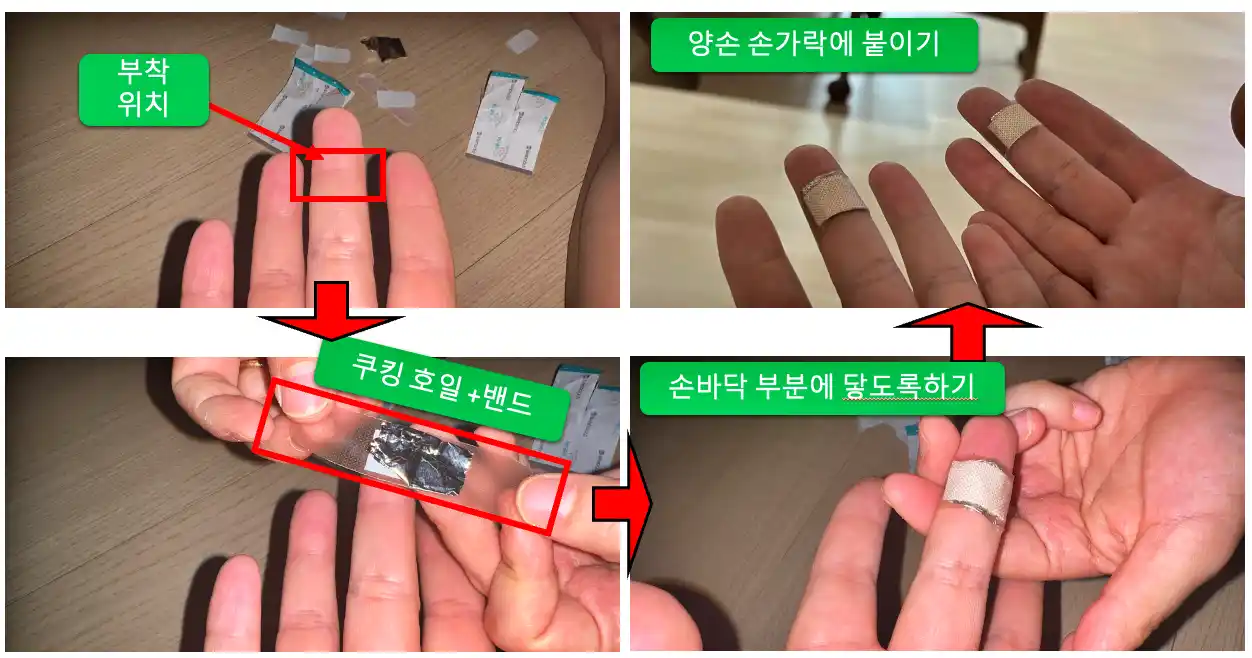 호일 밴드 만드는 방법은 일회용 밴드와 쿠킹 호일 입니다. 아래 사진처럼 쿠킹 호일을 밴드의 거즈 부분보다 조금크게 자릅니다. 호일을 밴드에 붙여주고, 양손 손가락에 붙여 줍니다. 여기에서 주의할 점은 호일은 손등이 아니라 손바닥 부분에 닿도록 붙여줘야 합니다.