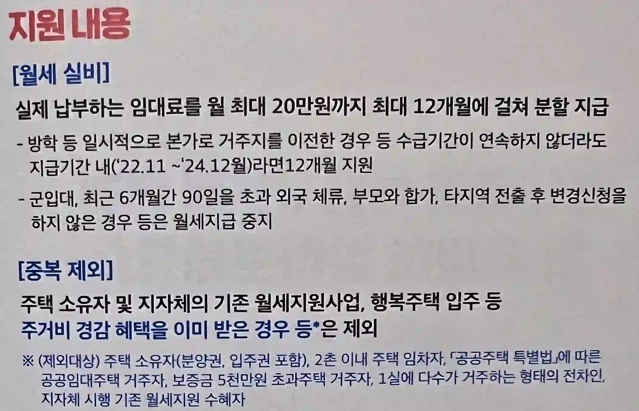- 실제 월세 범위 내에서 지원하며, 임차보증금, 관리비 등은 제외된 후 지원합니다.