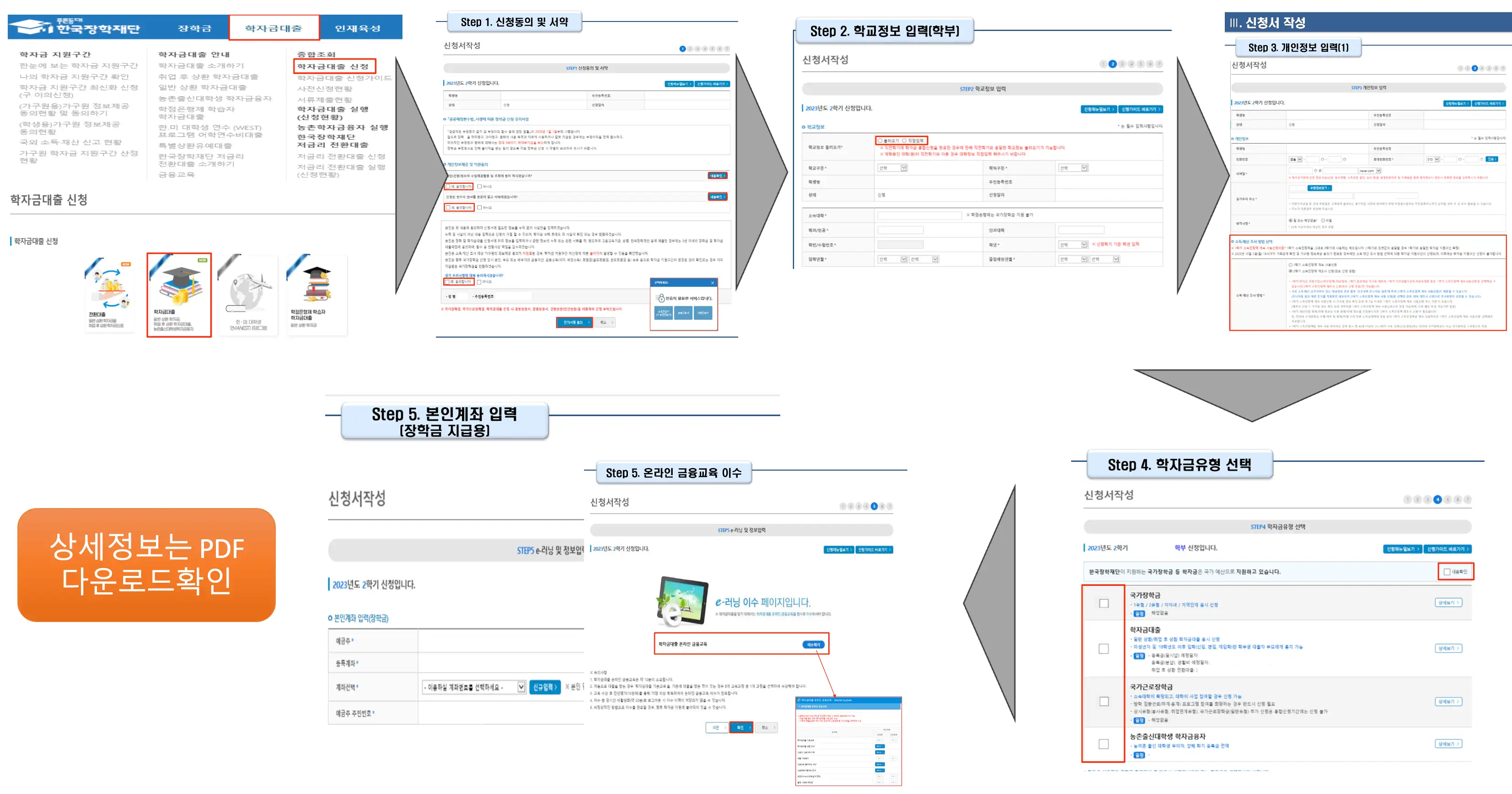 학자금대출 실행 시 단계는 아래와 같은 프로세스를 따르게 됩니다. 상세 내용은 유첨 드렸던 PDF에 상세히 나와 있으니 참조하시면 도움이 될 것 같습니다.