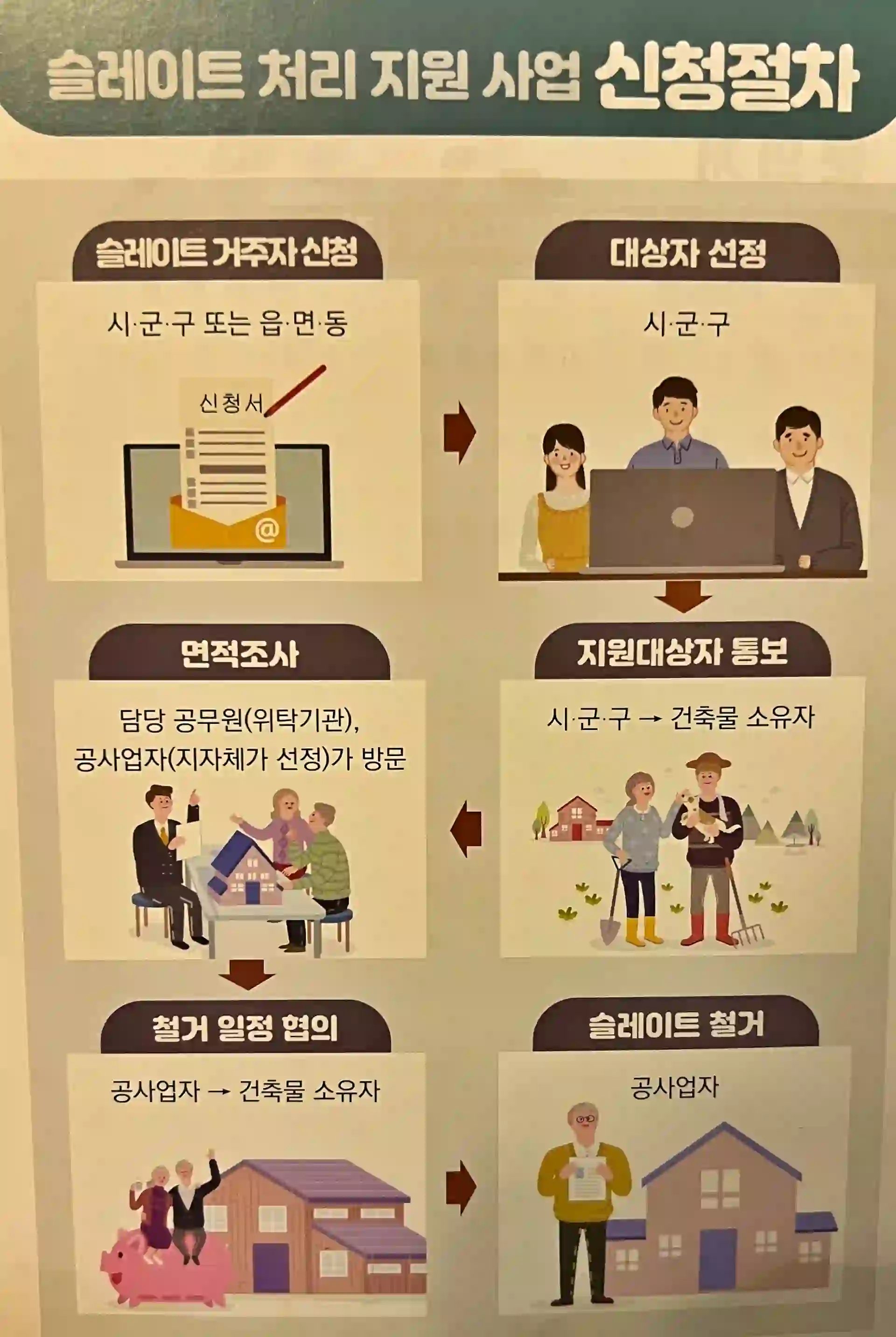 200m² 이하의 슬레이트 면적을 가진 창고나 축사도 지원 대상에 포함됩니다. 국비지원(50%, 23년 국비 849억 원)과 지자체 제원으로 지원함.