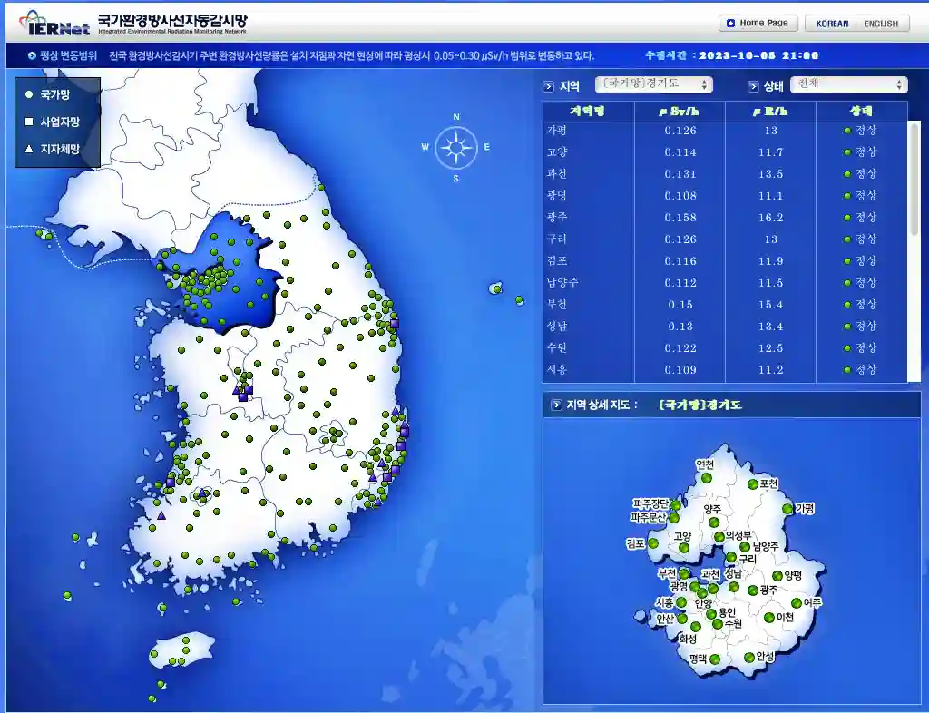 국가환경방사선자동감시망 : 한국원자력안전기술원이 운영하는 공식 플랫폼입니다. 여기서는 국내 방사선 수치를 실시간으로 확인할 수 있습니다. 전국적으로 방사선 수치를 수집하는 지점과 원전의 위치 등을 지도상에서 확인할 수 있습니다.
